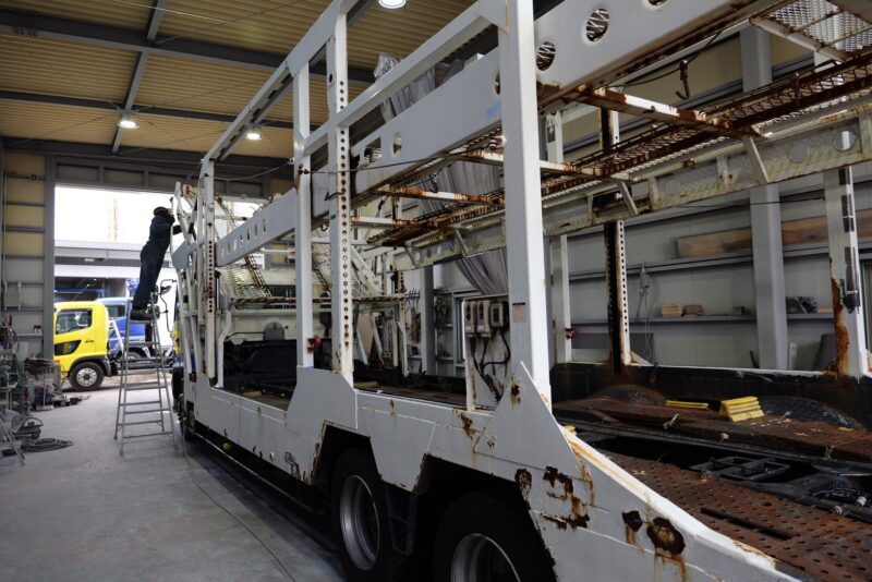 今回は、新しく販売ラインナップに加わる予定の日野レンジャー5台積みキャリアカーの整備風景を少しだけお見せします。