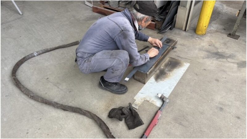 まずは、腐食が激しく強度が落ちてしまった部分の摘出からスタートです。「少し削ってパテで埋める」という安易な方法ではなく、ダメな部分はカットして新しく鉄板を現物合わせで加工し、溶接して強度を復元していきます。